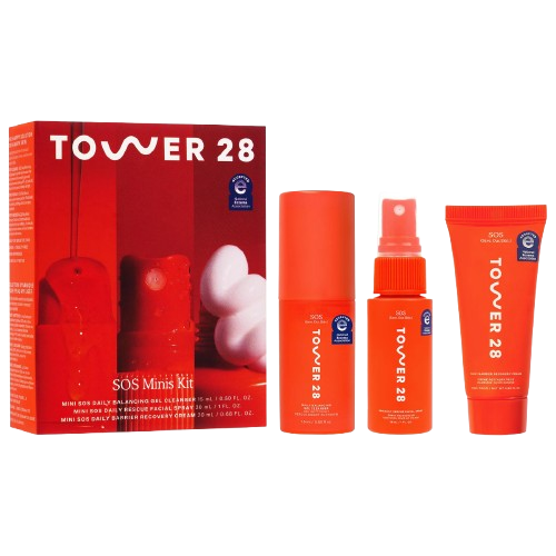 Tower 28 Beauty – Mini SOS Skincare Bestsellers Set er et limited edition hudpleiesett med tre miniversjoner av merkets mest populære SOS-produkter: SOS Cleanser, SOS Daily Rescue Facial Spray og SOS Barrier Recovery Cream. Sammen utgjør de en mild, men effektiv 3-stegs rutine som renser, beroliger og styrker hudbarrieren – perfekt for sensitiv, stresset eller uren hud.